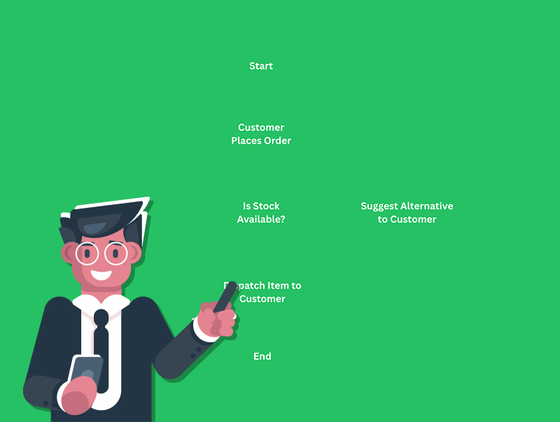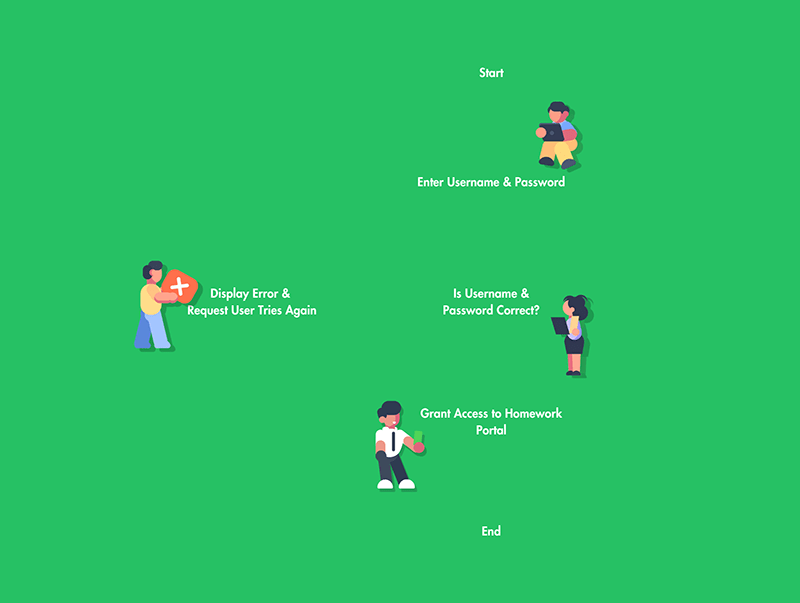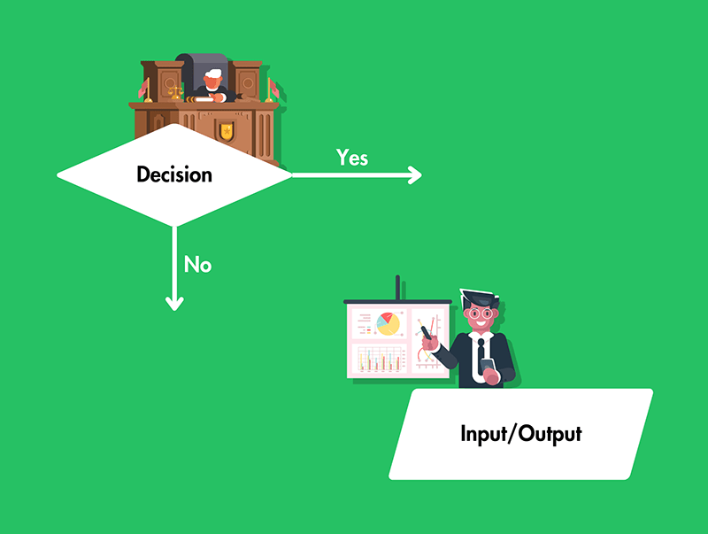 The flow can split into different paths based on the answer—for example, “Is the user logged in? Yes or No?”