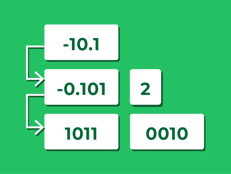 2.Normalise (shift the binary point left to get 1.0… form): shift two places left to give −0.101 × 2²