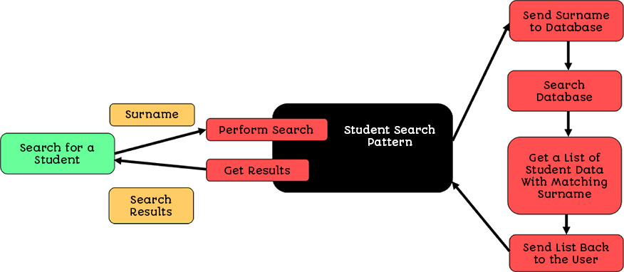 The ‘Search for A Student’ process does not know that the Student Search Pattern connects to a database and gets a list, all it knows is that it gives the black box a surname, and gets back some results.
