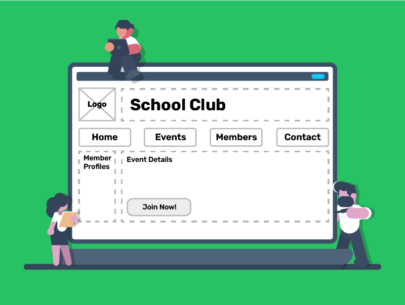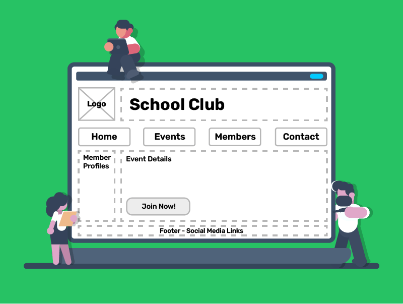 The club wants to show upcoming events, member profiles, and a sign-up button for new members.