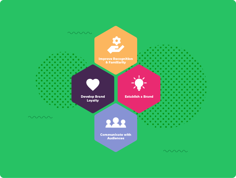 Its key purposes are to build recognition, establish a brand, develop loyalty, and communicate meaning without words.