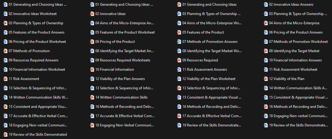 These resources are designed to cover the entirety of Component 2 Planning & Presenting a Micro-Enterprise Idea, including all three learning aims: